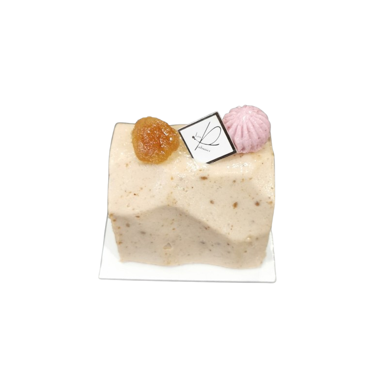 sur un biscuit chocolat et des petits morceaux de marrons confits.