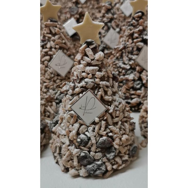 Sapin en chocolat lait ou noir, avec des bâtonnets d'amandes, cramberries et pistaches.