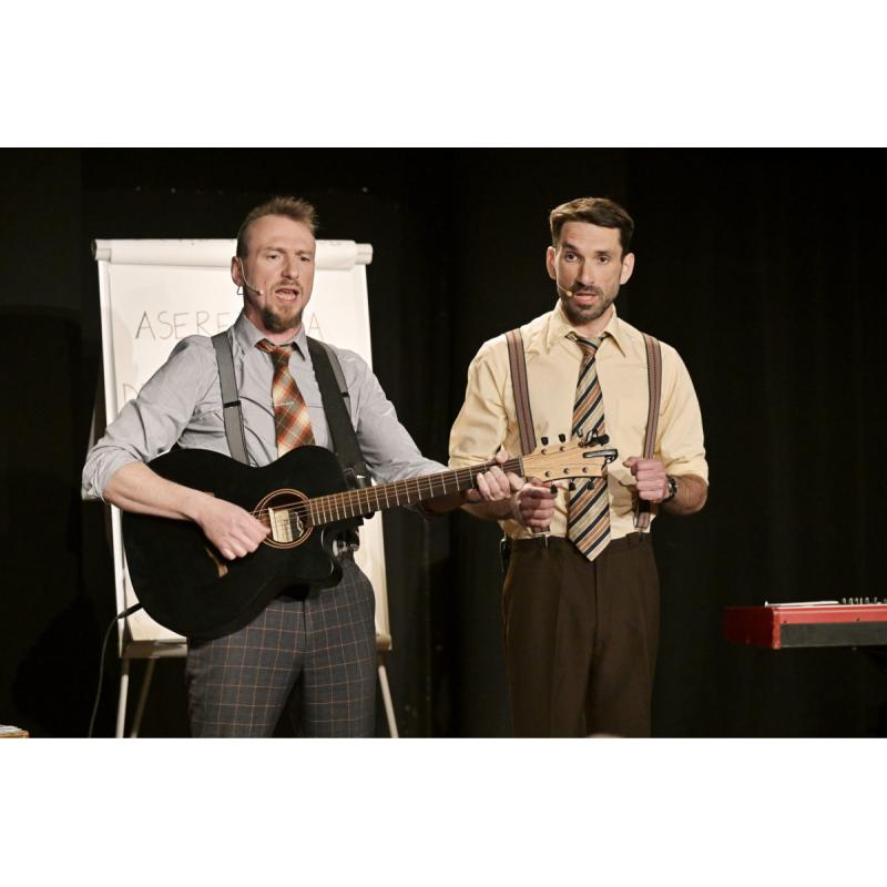 Un spectacle décapant mené par deux comédiens – musiciens – chanteurs qui mettent un point d’honneur à fournir aux spectateurs non seulement un texte précis qui s’inscrit dans une intrigue cohérente mais également une exécution exigeante de la musique, avec une véritable maîtrise vocale et instrumentale.