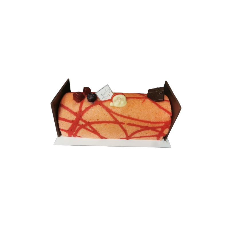 Bûche avec une crème légère aux fruits rouges garnie de framboises,